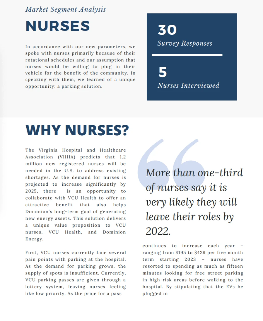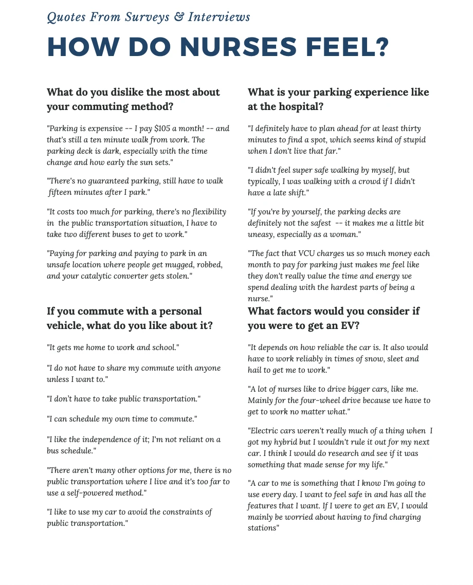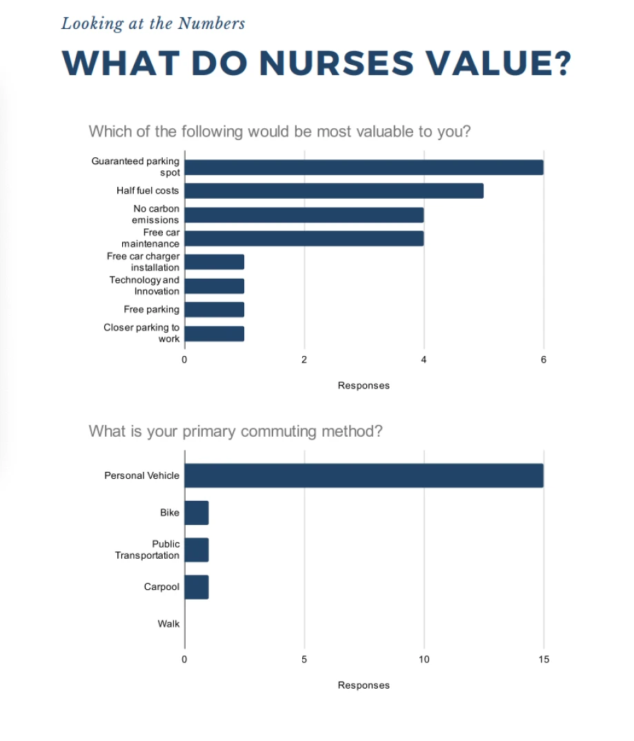 Uncovered a concrete value exchange for healthcare workers (parking reliability and charging), strengthening desirability.